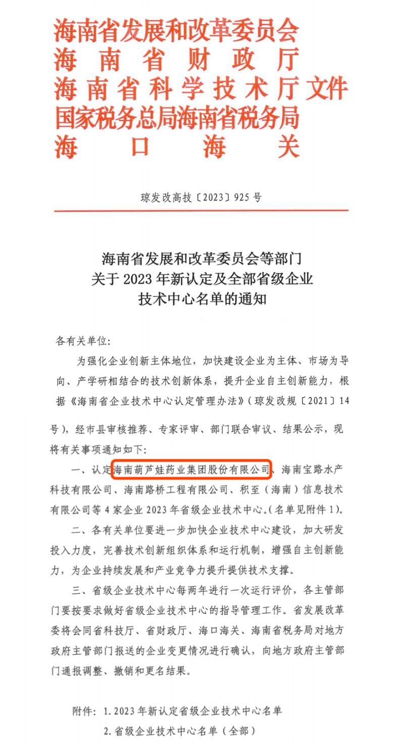 近日,海南省发改委等多部门联合公布了《关于2023年新认定及全部省级企业技术中心名单的通知》,其中,海南JJB电竞药业集团股份有限公司成功通过评审,被认定为省级企业技术中心,是本次获批的4家企业之一。